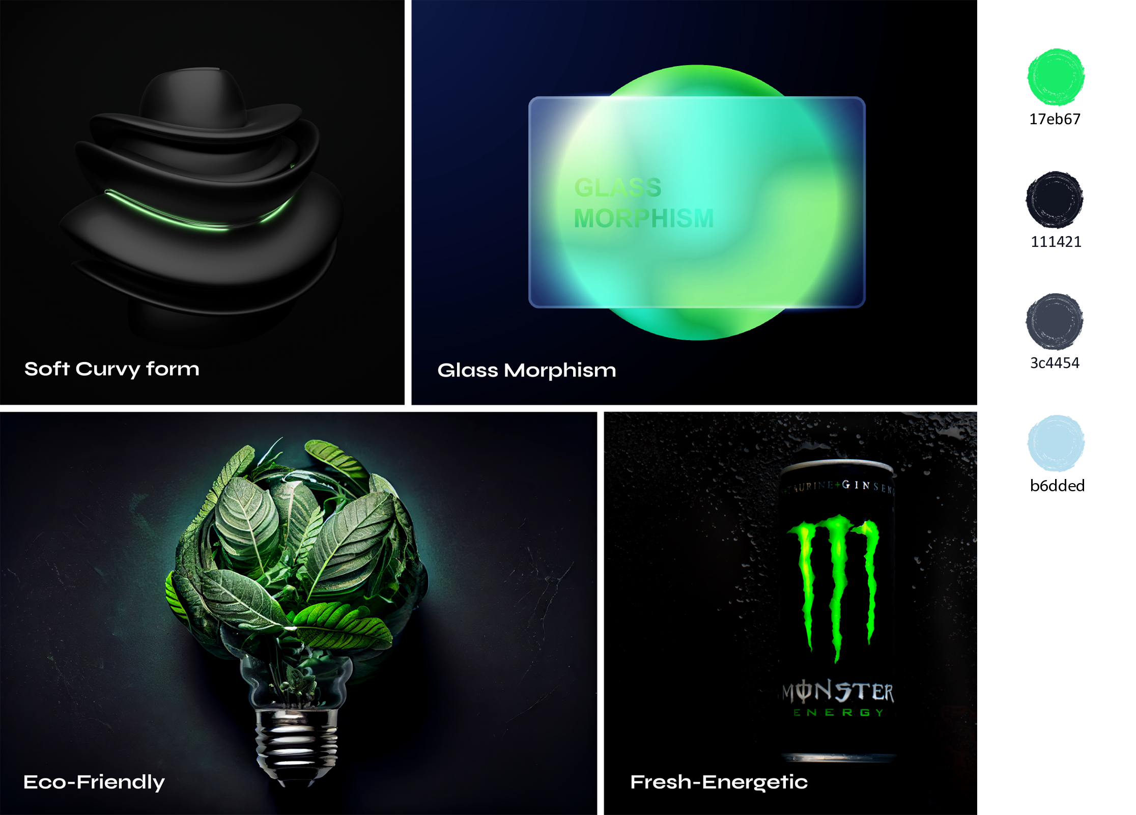 Using a neon bright green color alongside the mat glass effect on the dark blue background creates an eco-energetic vibe in this mood board.
